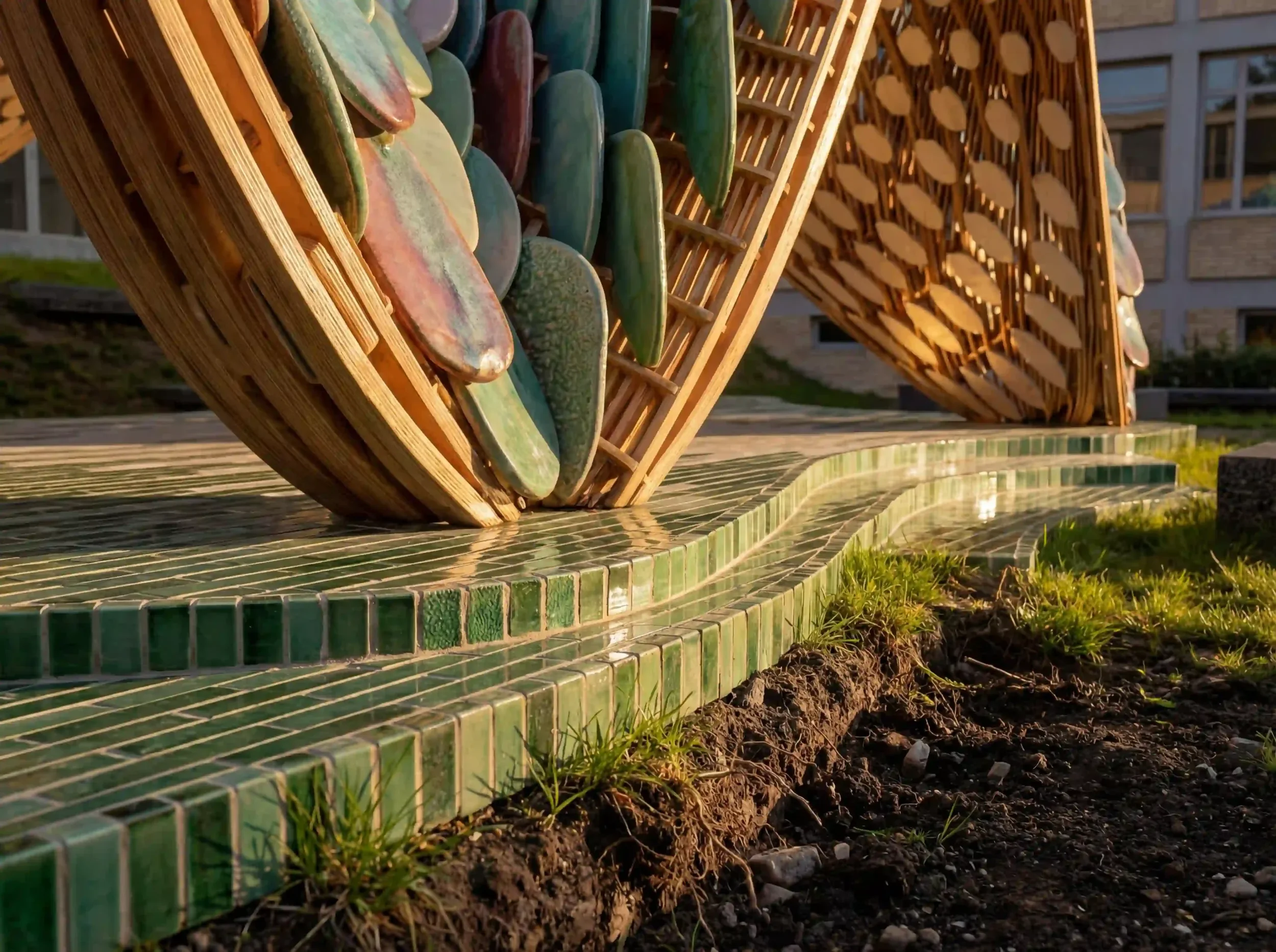 DRAC transformiert den Garten des Instituto Cervantes in einen temporären, urbanen Resonanzraum. Inspiriert von Antoni Gaudí verbindet die Installation Holz, Keramik und textile Elemente zu einer leichten, modularen Struktur zwischen Handwerk und zeitgenössischem Design.